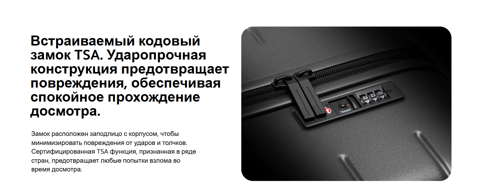 Модель оснащена замком TSA для безопасных перелетов, а также молнией с защитой от разрыва. Дополнительно реализована защита от влаги, что помогает сохранить вещи в безопасности при любых условиях.